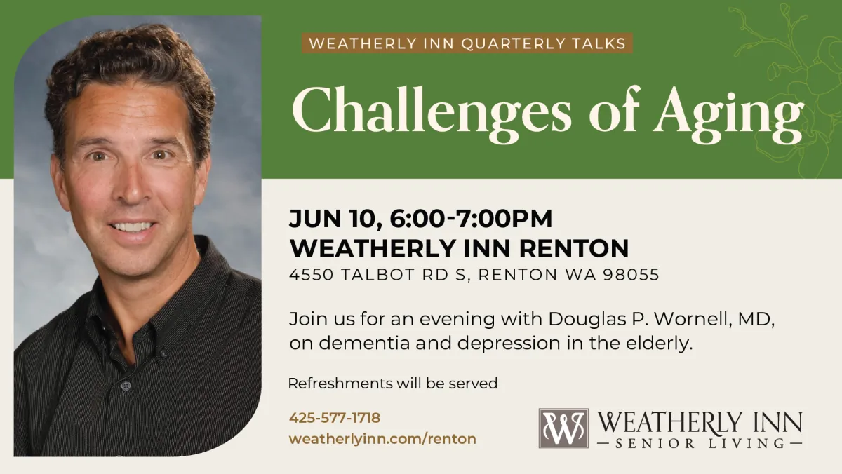 Join us for an evening with Douglas P. Wornell, MD, on the Challenges of Aging: dementia and depression in the elderly.